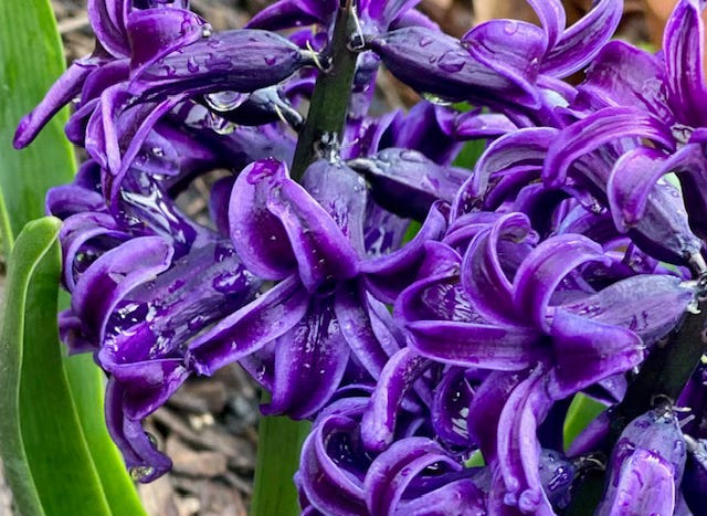 We all pass time together - the purple hyacinths, the bold daffodils, the loved dog, and generations of trees.